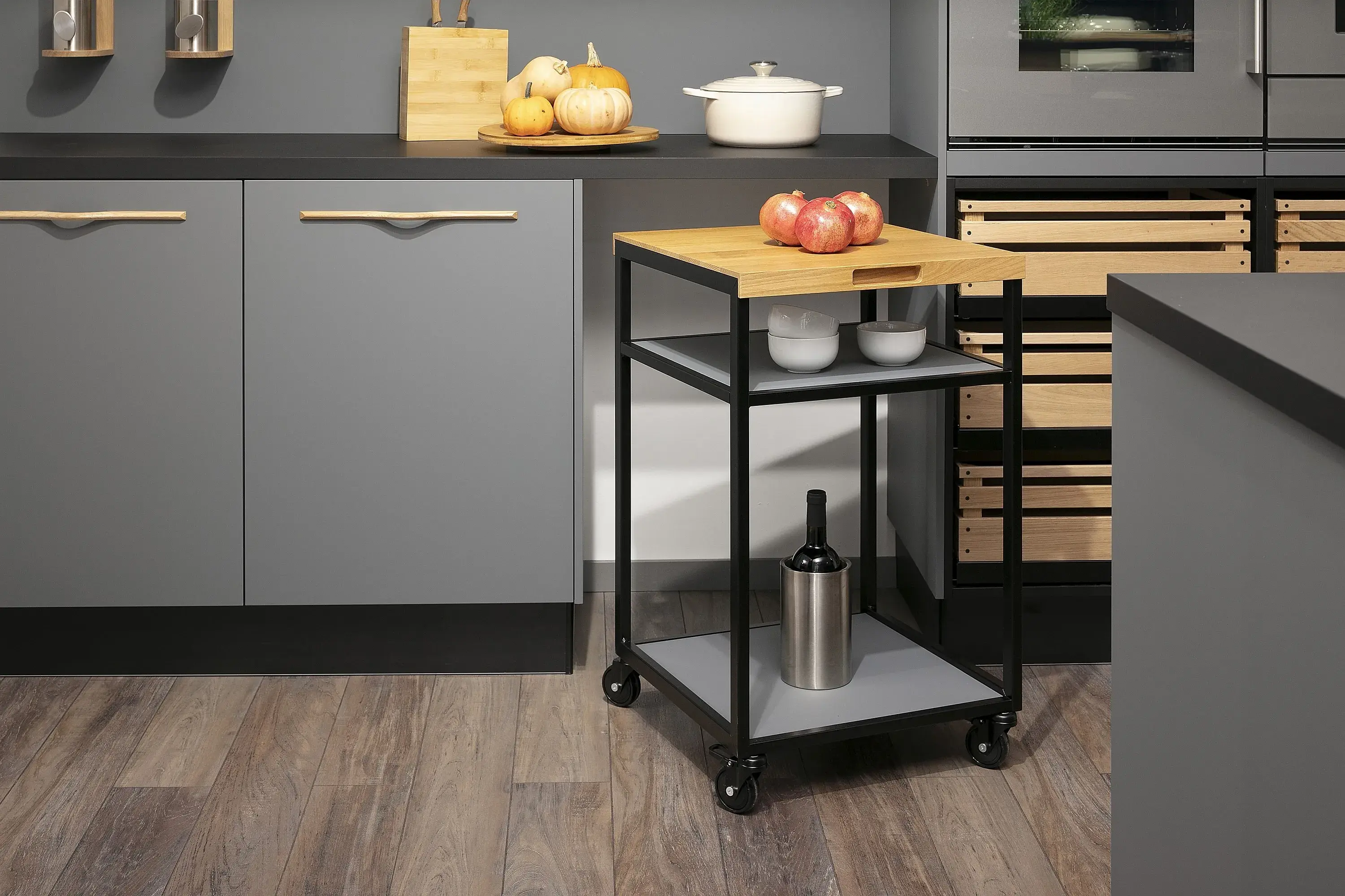 Als allzeit mobiler UnterschrankSchon gemerkt? Die einstigen Teewagen sind längst zurück – und das in den unterschiedlichsten Ausführungen: ganz offen oder mit Schubladen und Schranktüren. Ideal ist es, wenn so ein Servierwagen sein eigenes „Carport“ unter der Arbeitsplatte bekommt, denn dann kann man ihn schnell hervorholen und genauso schnell wieder aus dem Weg rollen.Ein Trolley erweist sich bei vielen Gelegenheiten als nützlich, sei es als Beistelltisch mit Wein, Öl, Essig oder Brot an Bord, als Servierwagen für die Kaffeetafel oder um Gästen eine reiche Auswahl an Flaschengetränken zu servieren. Dank vier leichtgängiger Rollen lassen sich auf ihm auch Frühstückscerealien, Obst oder Käse schnell und einfach herbeizaubern.